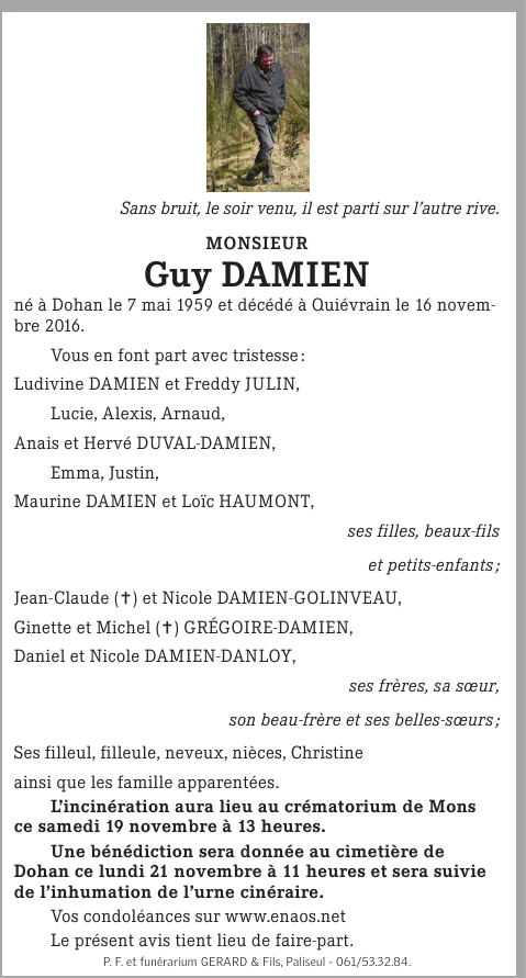 Décédé à Quiévrain (7380) le mercredi 16 novembre 2016 à l'âge de 57 ans