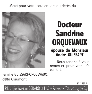 Décédée à Libramont (6800) le lundi 7 novembre 2016 à l'âge de 45 ans