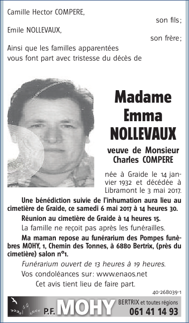 Décédée à Libramont (6800) le mercredi 3 mai 2017 à l'âge de 85 ans