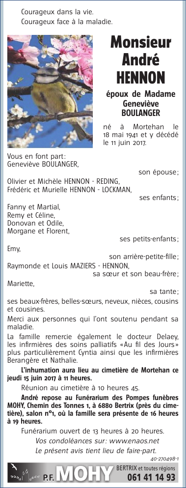 Décédé à Mortehan (6880) le dimanche 11 juin 2017 à l'âge de 76 ans