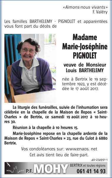 Décédée à Bertrix (6880) le jeudi 17 août 2017 à l'âge de 93 ans