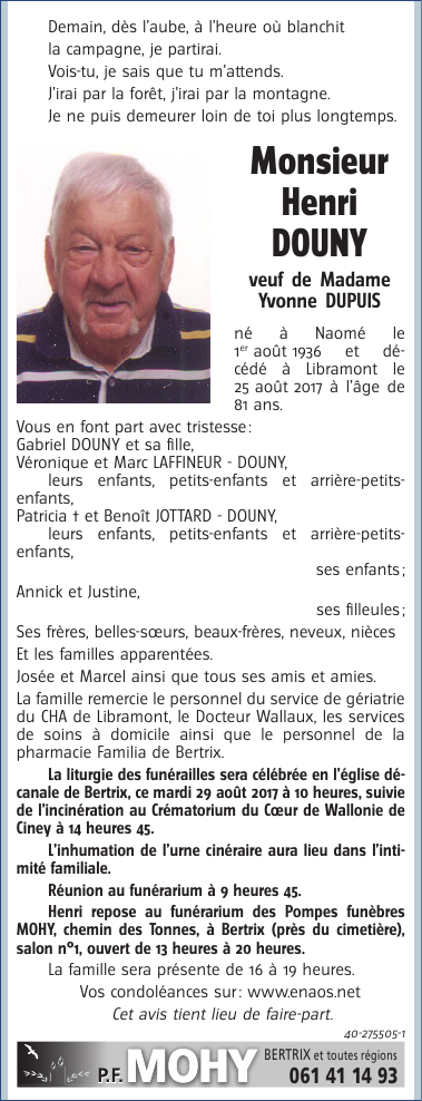 Décédé à Libramont (6800) le vendredi 25 août 2017 à l'âge de 81 ans