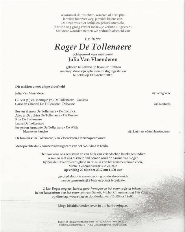 Décédé à Eeklo (9900) le vendredi 13 octobre 2017 à l'âge de 87 ans