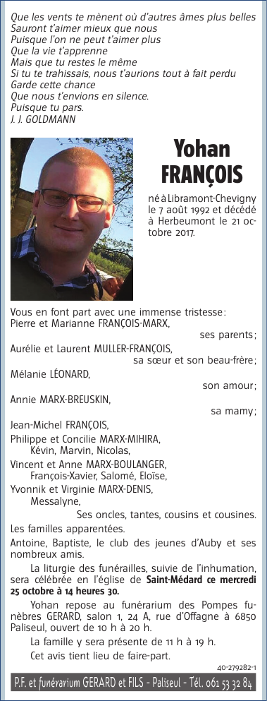 Décédé à Herbeumont (6887) le samedi 21 octobre 2017 à l'âge de 25 ans