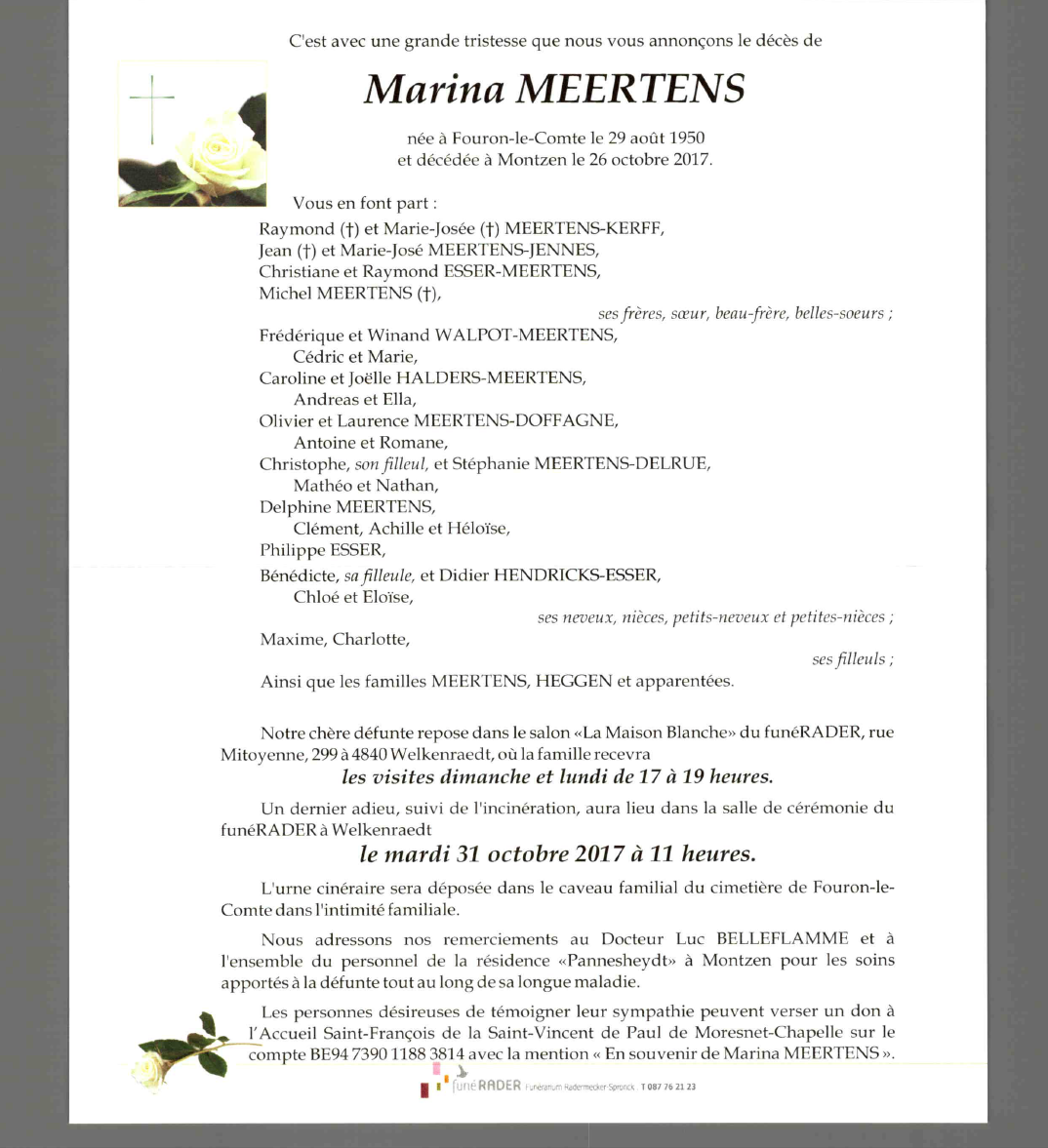 Décédée à Montzen (4850) le jeudi 26 octobre 2017 à l'âge de 67 ans