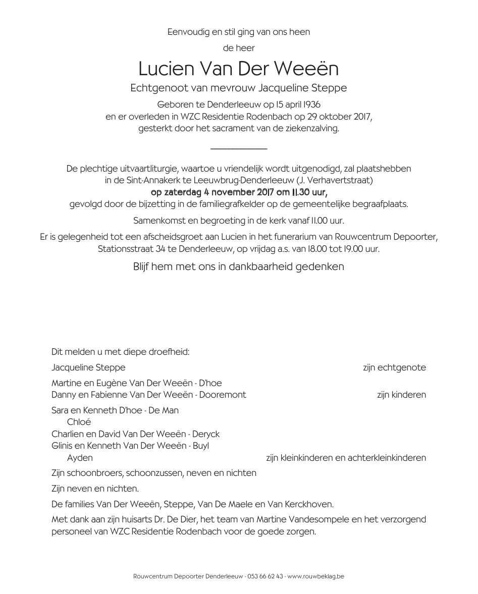 Décédé à Denderleeuw (9470) le dimanche 29 octobre 2017 à l'âge de 81 ans