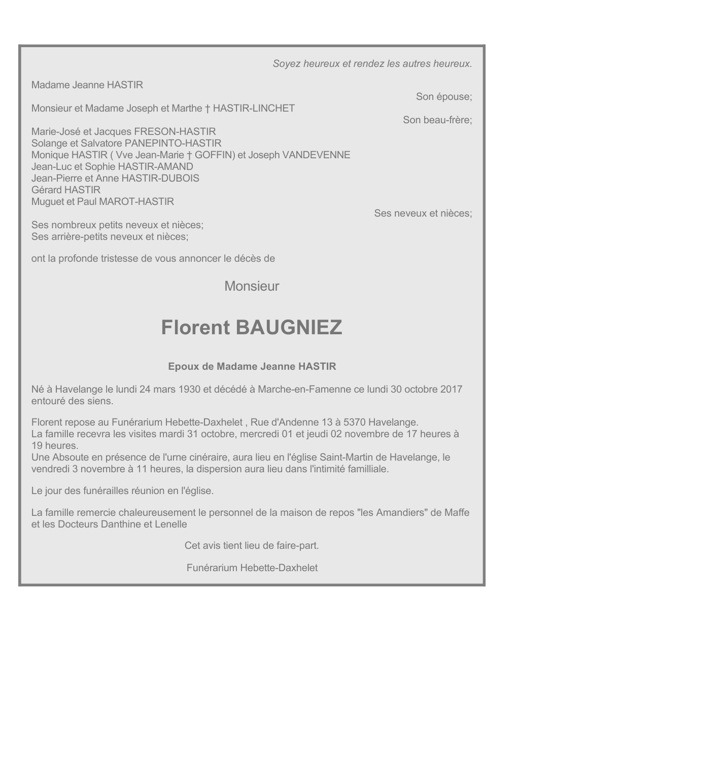 Décédé à Marche-en-Famenne (6900) le lundi 30 octobre 2017 à l'âge de 87 ans