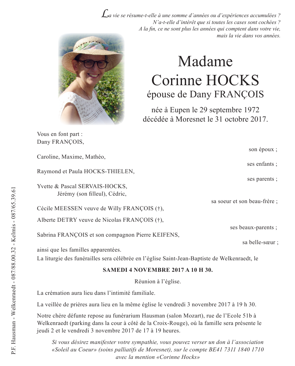 Décédée à Montzen (4850) le mardi 31 octobre 2017 à l'âge de 45 ans
