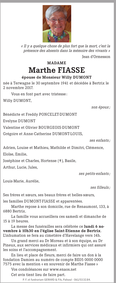 Décédée à Bertrix (6880) le jeudi 2 novembre 2017 à l'âge de 76 ans