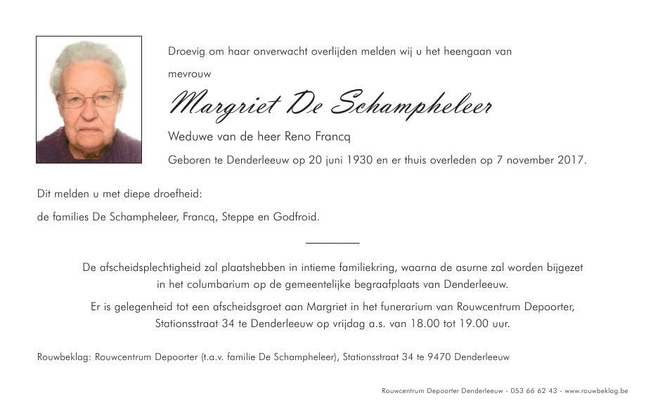 Décédée à Denderleeuw (9470) le mardi 7 novembre 2017 à l'âge de 87 ans