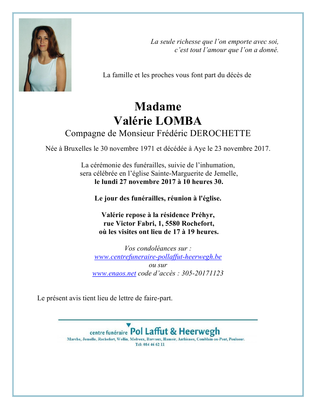 Décédée à Marche-en-Famenne (6900) le jeudi 23 novembre 2017 à l'âge de 45 ans