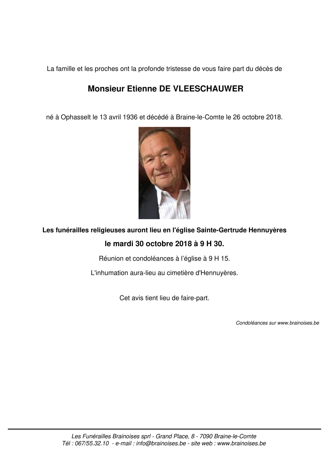 Décédé à Braine-le-Comte (7090) le vendredi 26 octobre 2018 à l'âge de 82 ans
