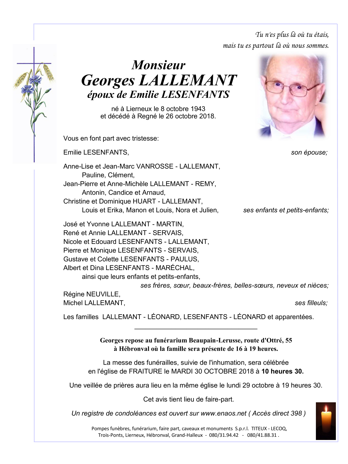 Décédé à Regné (6690) le vendredi 26 octobre 2018 à l'âge de 75 ans