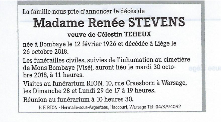 Décédée à Liège (4020) le vendredi 26 octobre 2018 à l'âge de 92 ans