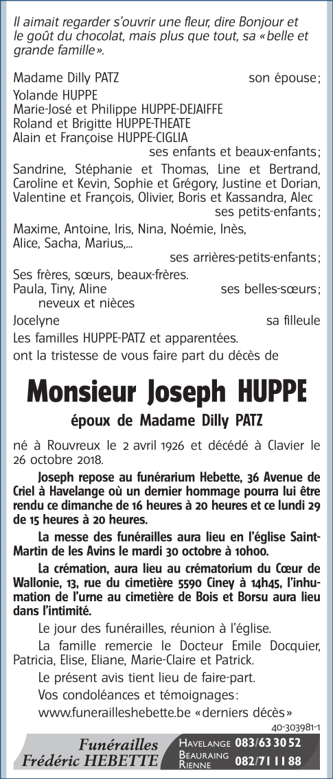 Décédé à Clavier (4560) le vendredi 26 octobre 2018 à l'âge de 92 ans