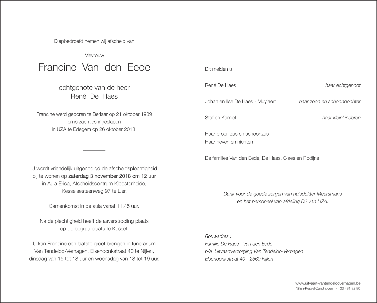 Décédée à Edegem (2650) le vendredi 26 octobre 2018 à l'âge de 79 ans