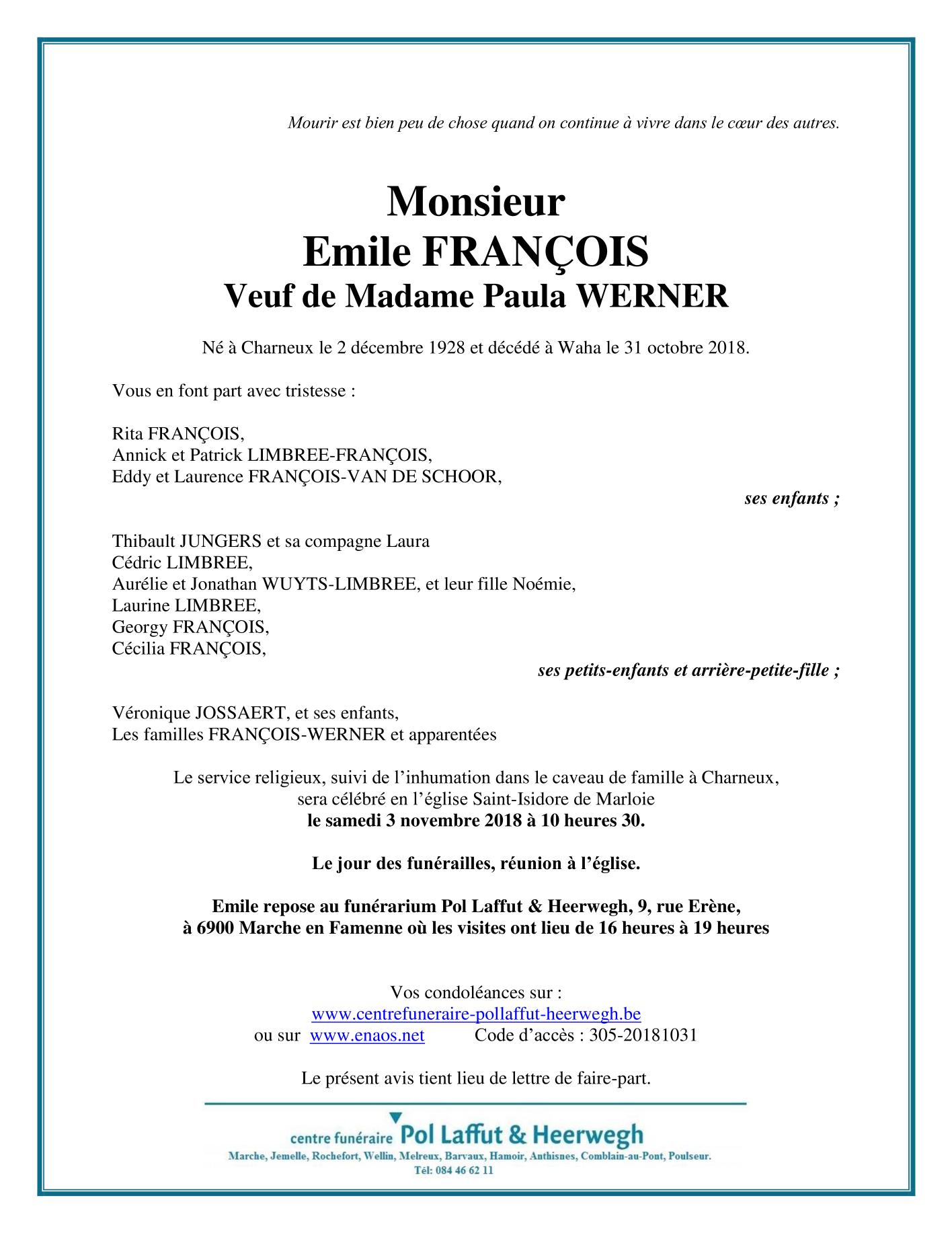 Décédé à Waha (6900) le mercredi 31 octobre 2018 à l'âge de 89 ans