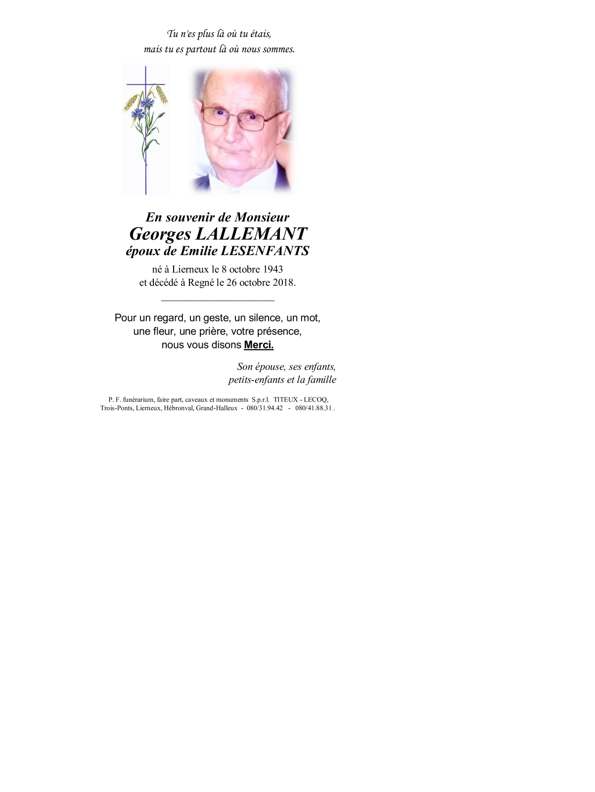 Décédé à Regné (6690) le vendredi 26 octobre 2018 à l'âge de 75 ans
