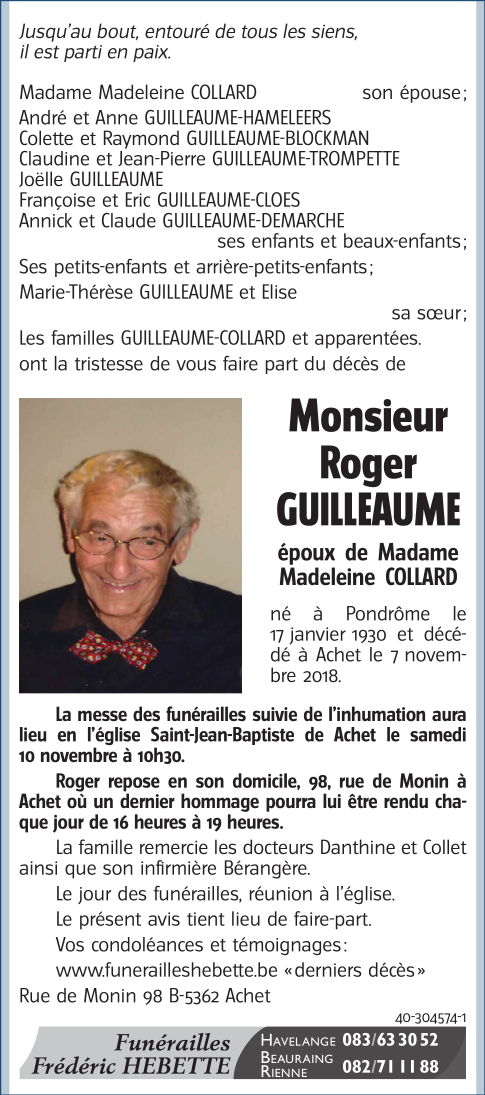 Died in Achet (5362 ) on 07 November 2018 at the age of 88 years