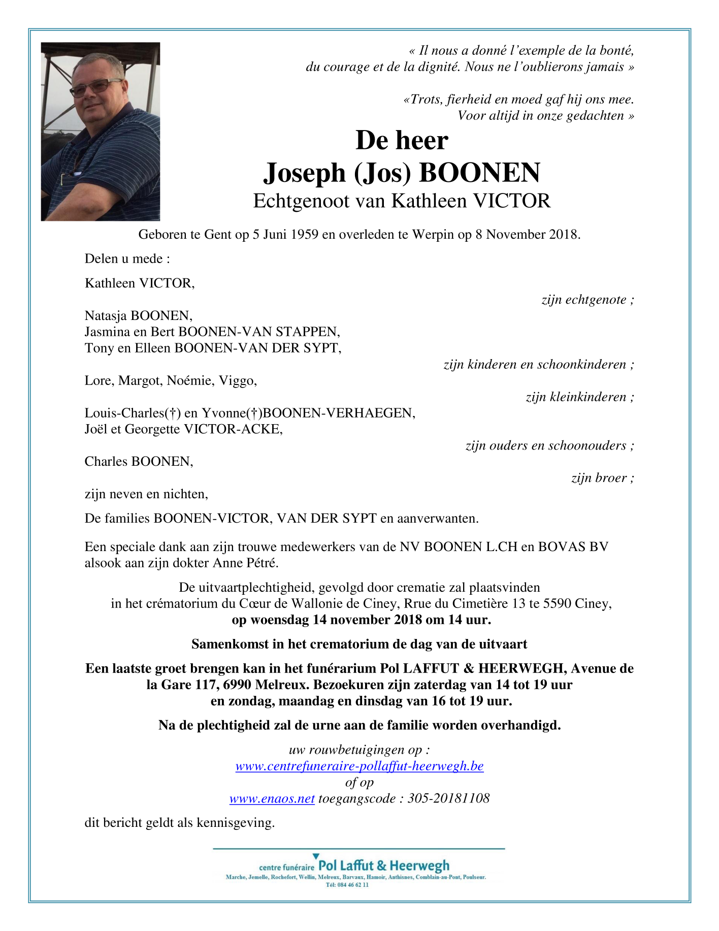 Décédé à Werpin (6990) le jeudi 8 novembre 2018 à l'âge de 59 ans