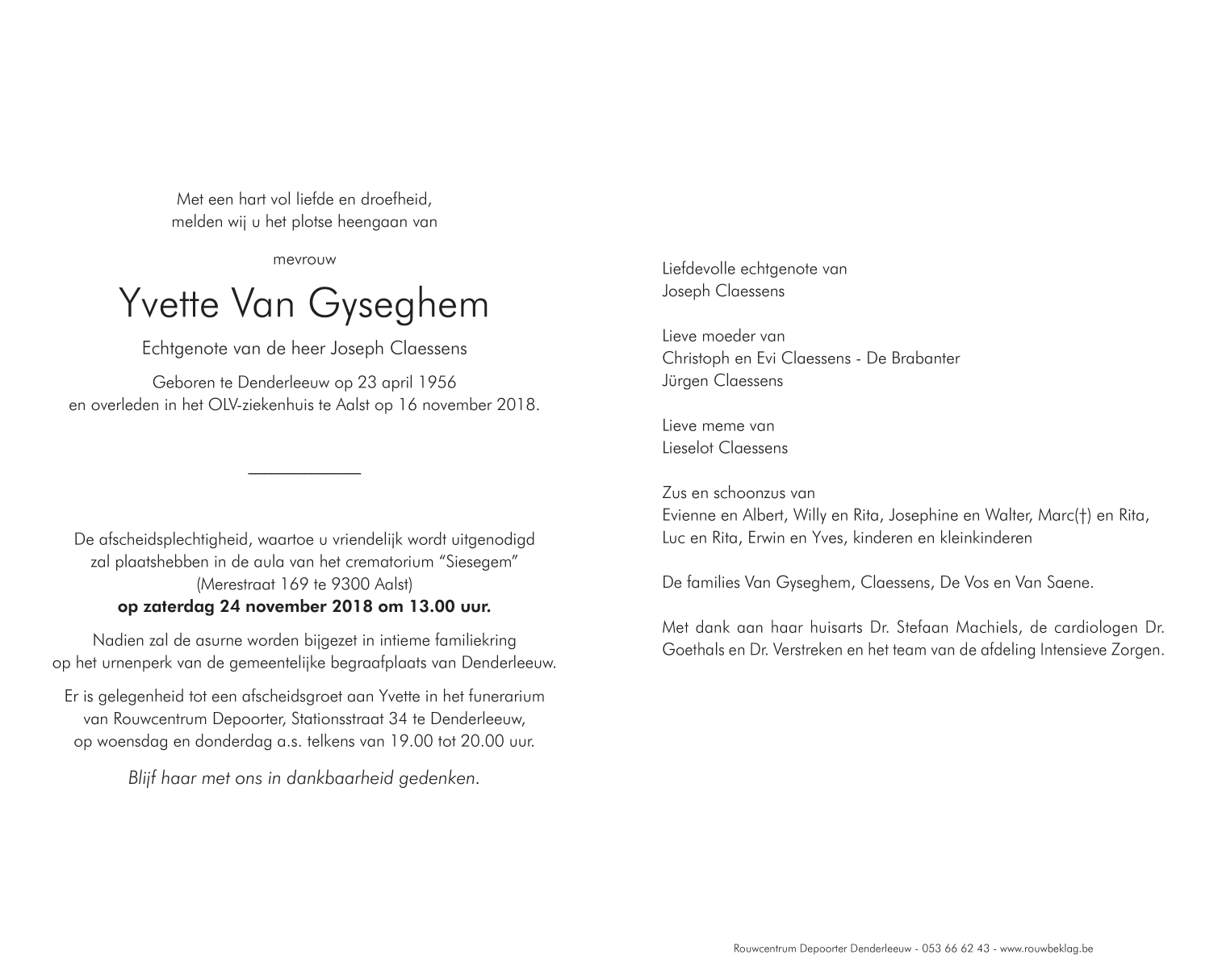Décédée à Aalst (9300) le vendredi 16 novembre 2018 à l'âge de 62 ans