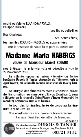 Overleden te Huy (4500) op zaterdag 24 november 2018 op 85-jarige leeftijd