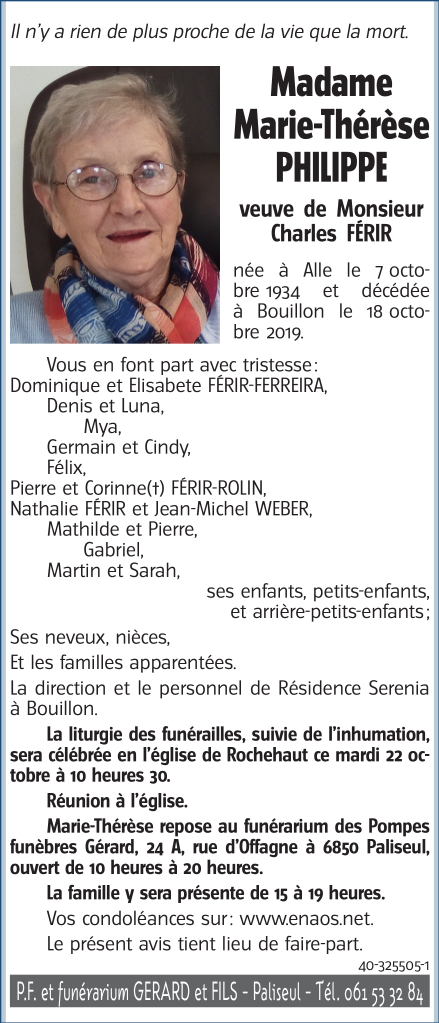 Décédée à Bouillon (6830) le vendredi 18 octobre 2019 à l'âge de 85 ans