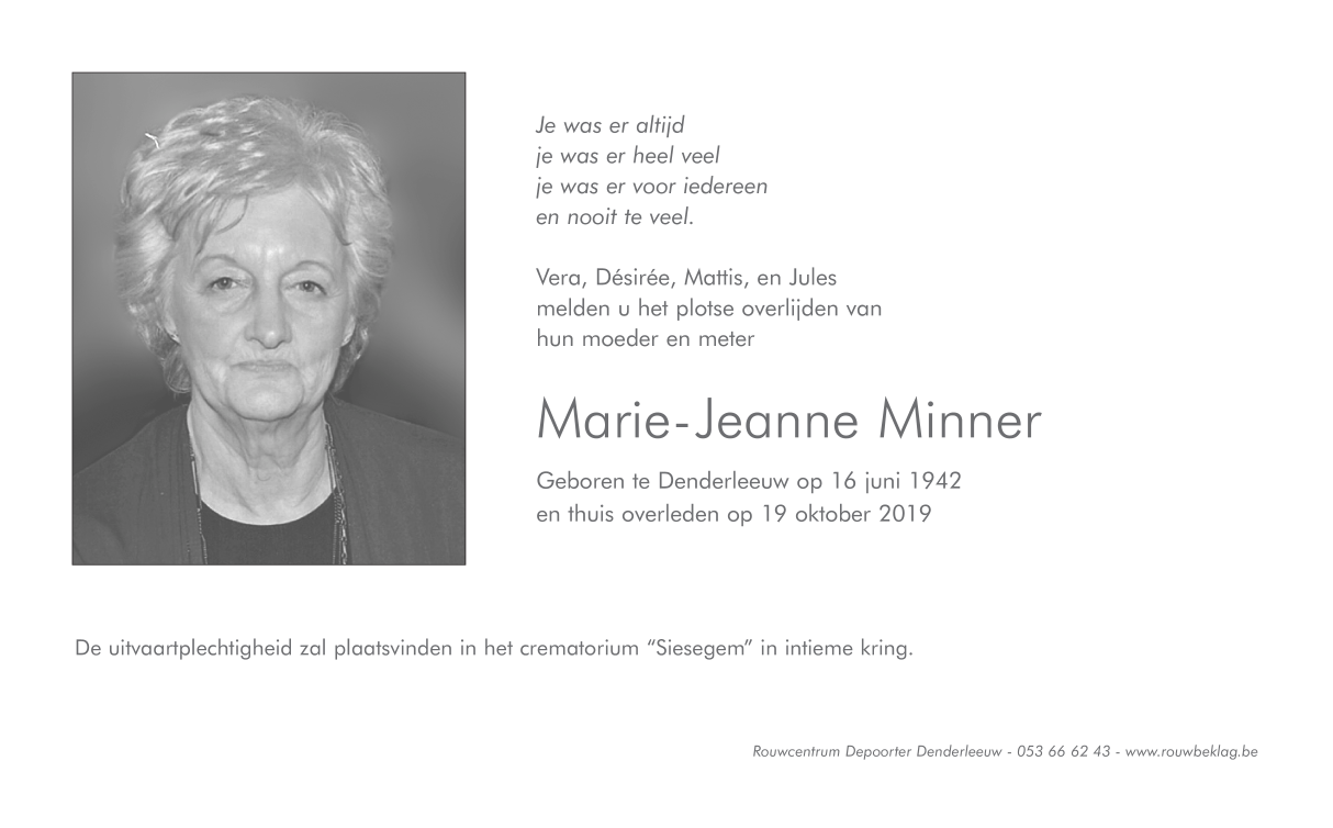 Décédée à Denderleeuw (9470) le samedi 19 octobre 2019 à l'âge de 77 ans