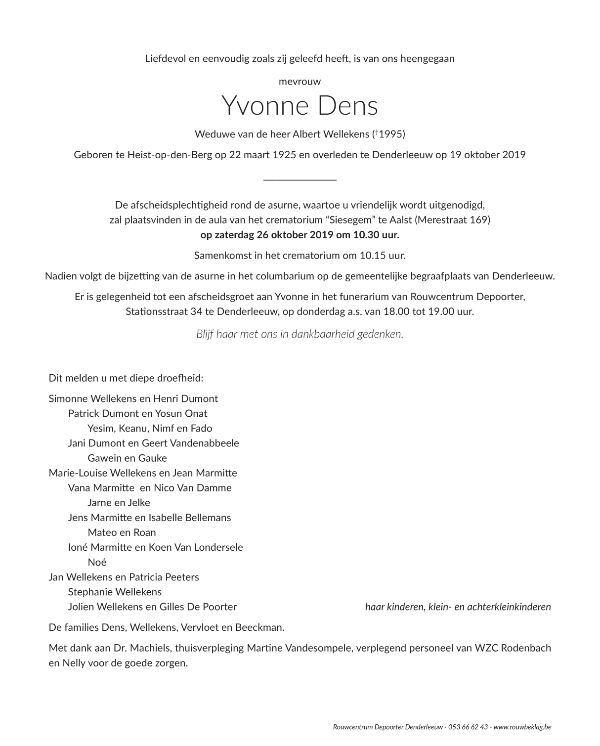 Décédée à Denderleeuw (9470) le samedi 19 octobre 2019 à l'âge de 94 ans