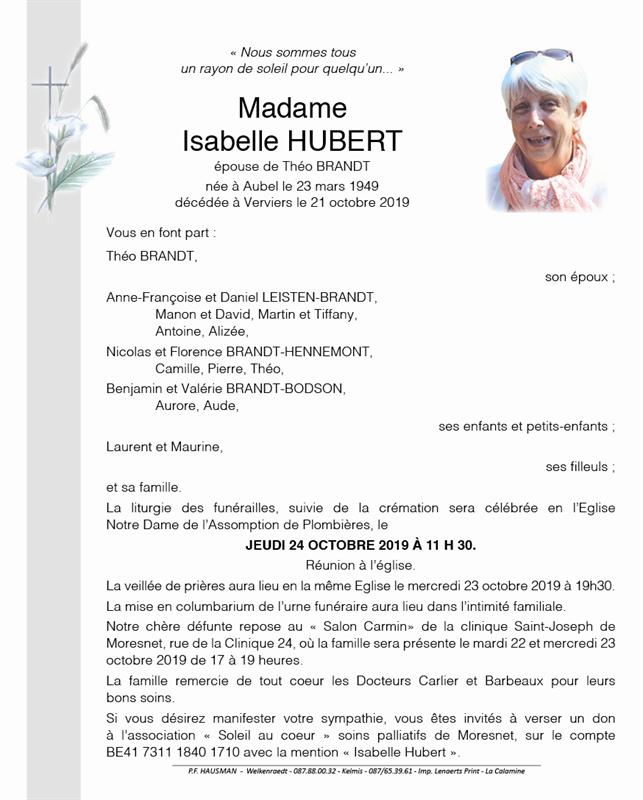 Décédée à Verviers (4800) le lundi 21 octobre 2019 à l'âge de 70 ans