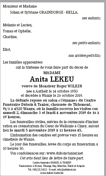 Décédée à Wanze (4520) le samedi 26 octobre 2019 à l'âge de 69 ans