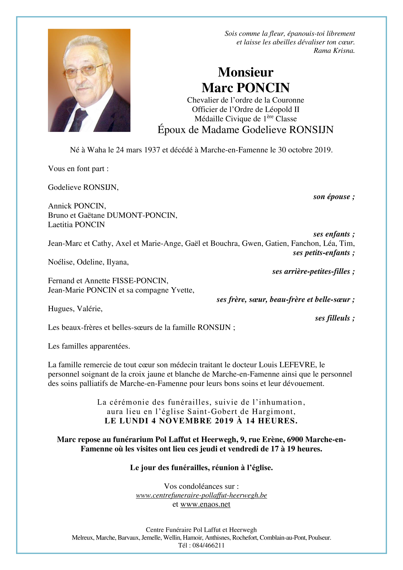 Décédé à Marche-en-Famenne (6900) le mercredi 30 octobre 2019 à l'âge de 82 ans