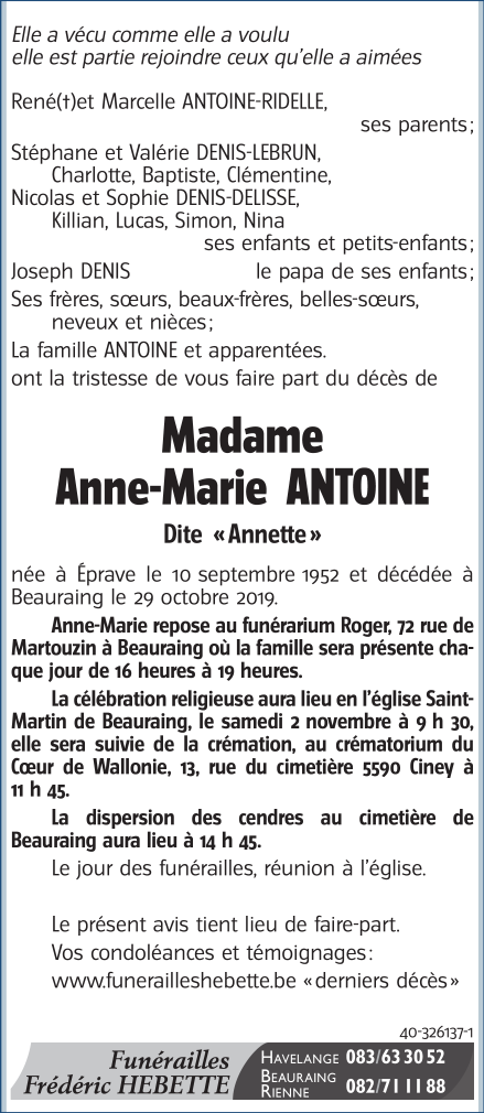 Décédée à Beauraing (5570) le mardi 29 octobre 2019 à l'âge de 67 ans