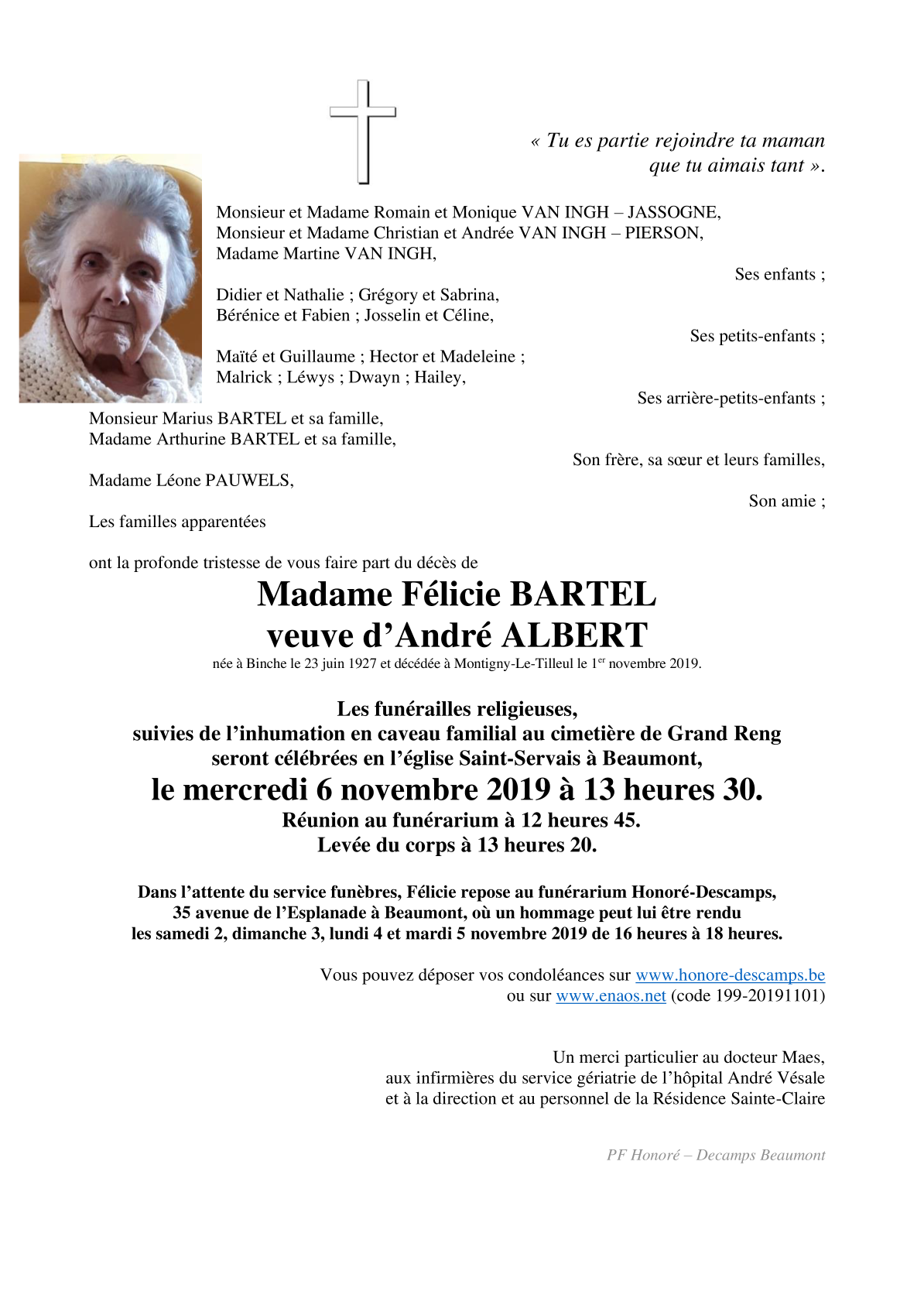 Décédée à Montigny-le-Tilleul (6110) le vendredi 1 novembre 2019 à l'âge de 92 ans