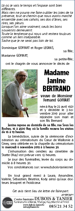Fallecida en Huy (4500) el domingo, 3 de noviembre de 2019 a la edad de 92 años