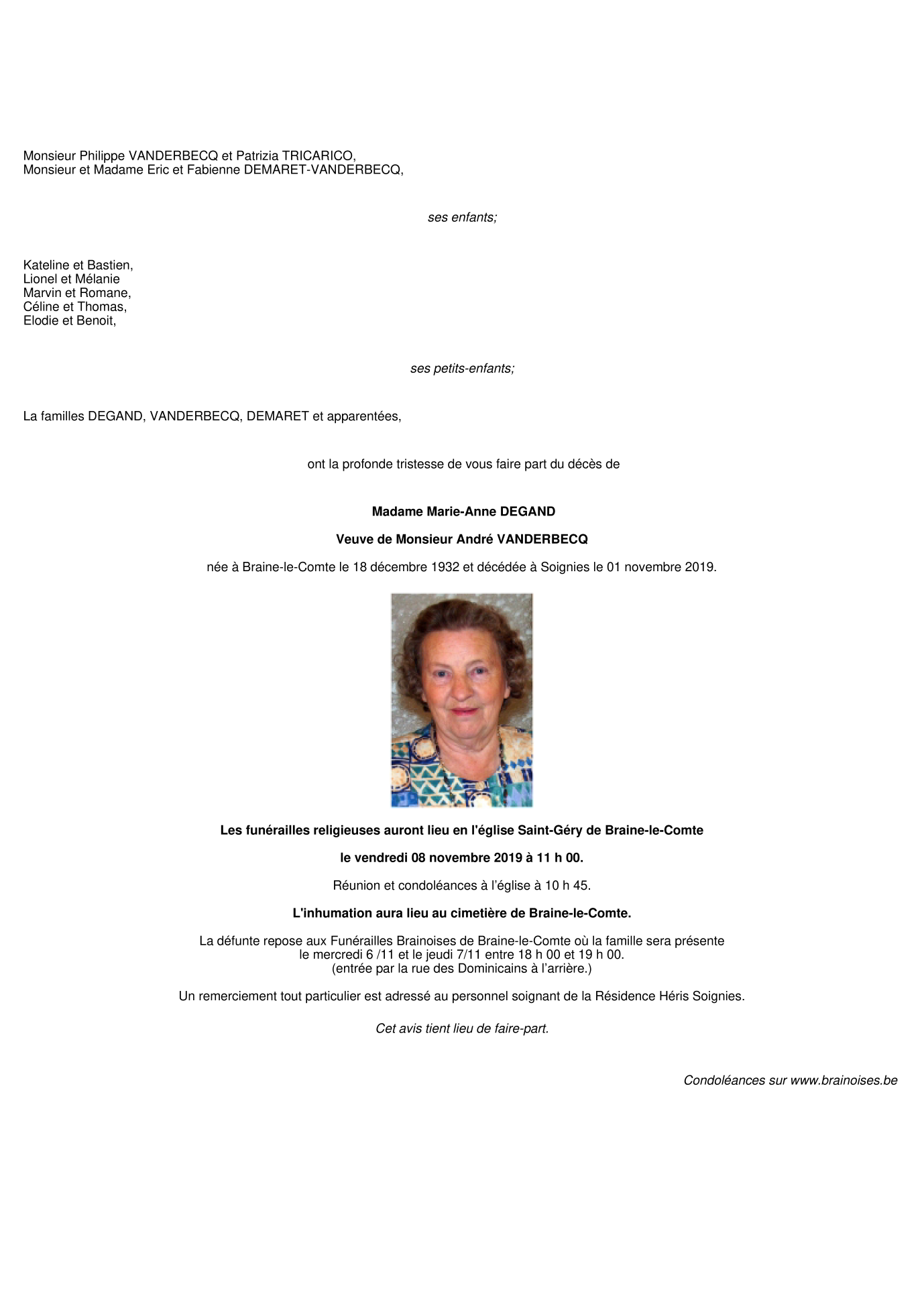 Fallecida en Soignies (7060) el viernes, 1 de noviembre de 2019 a la edad de 86 años