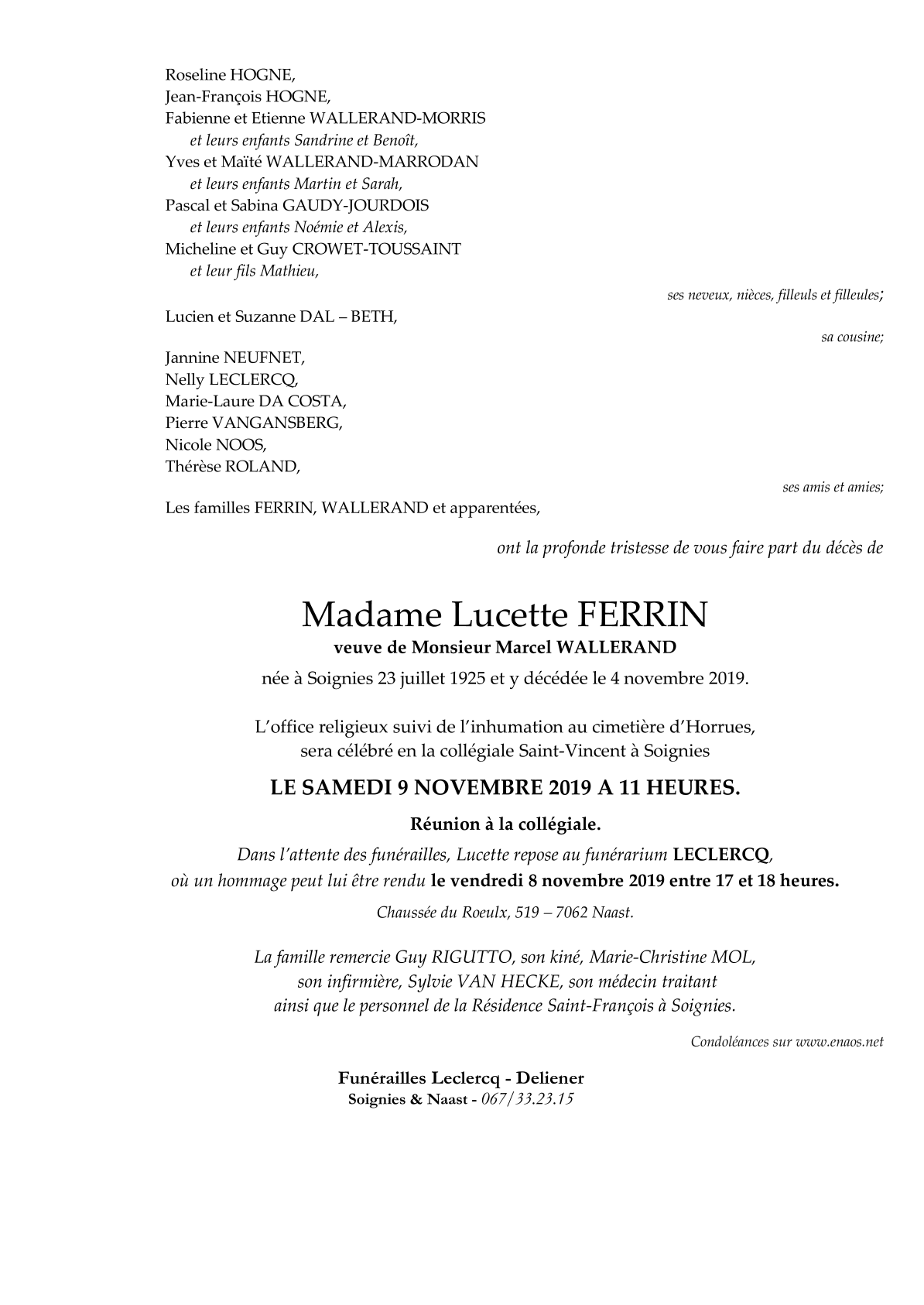 Décédé à Soignies (7060) le lundi 4 novembre 2019 à l'âge de 94 ans