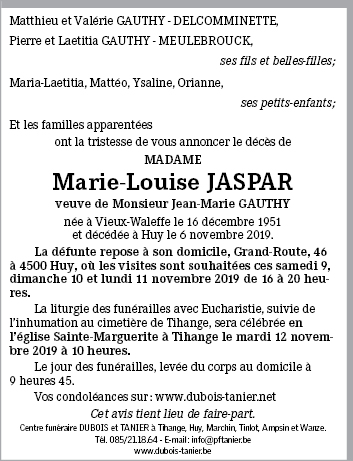 Décédée à Huy (4500) le mercredi 6 novembre 2019 à l'âge de 67 ans