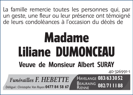 Décédée à Vencimont (5575) le samedi 26 octobre 2019 à l'âge de 75 ans
