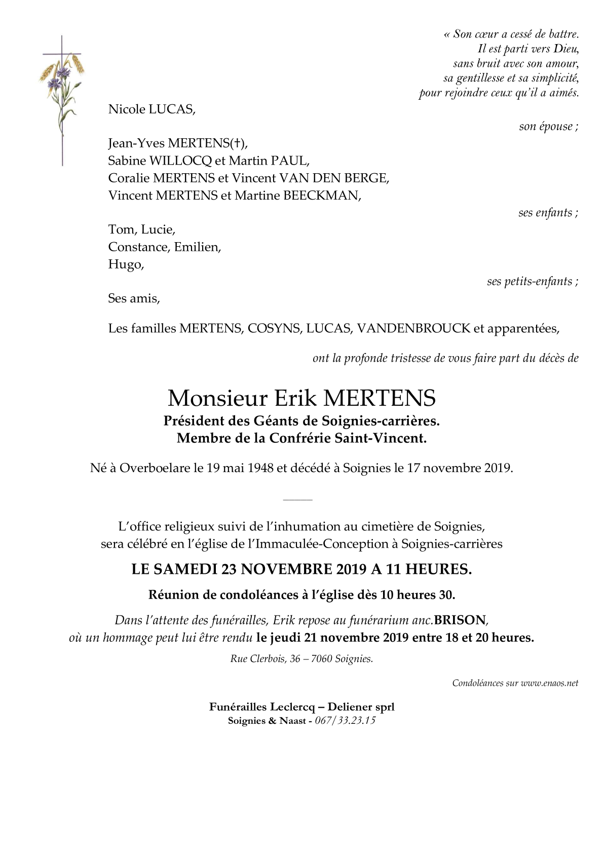 Décédé à Soignies (7060) le dimanche 17 novembre 2019 à l'âge de 71 ans