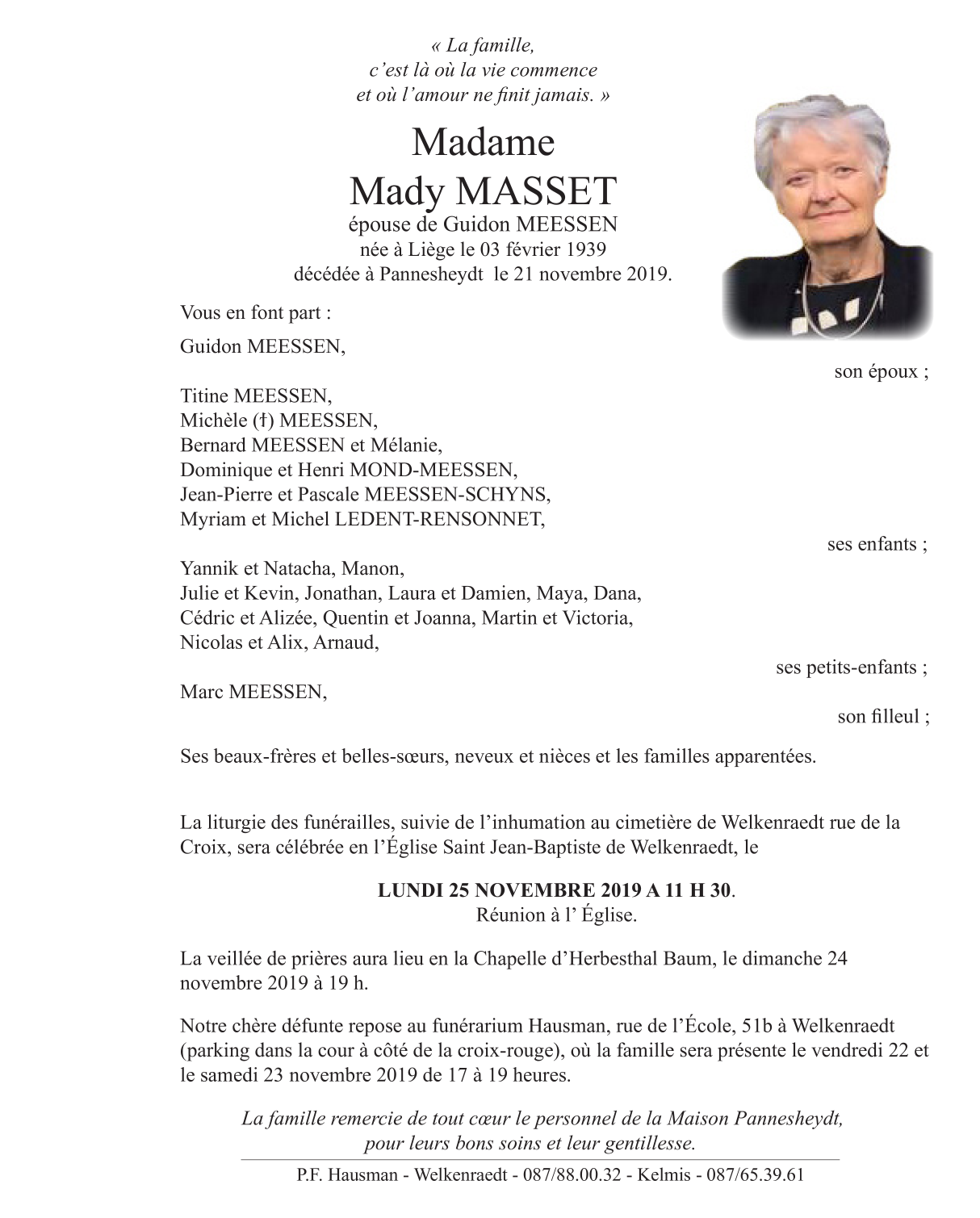 Décédée à Montzen (4850) le jeudi 21 novembre 2019 à l'âge de 80 ans