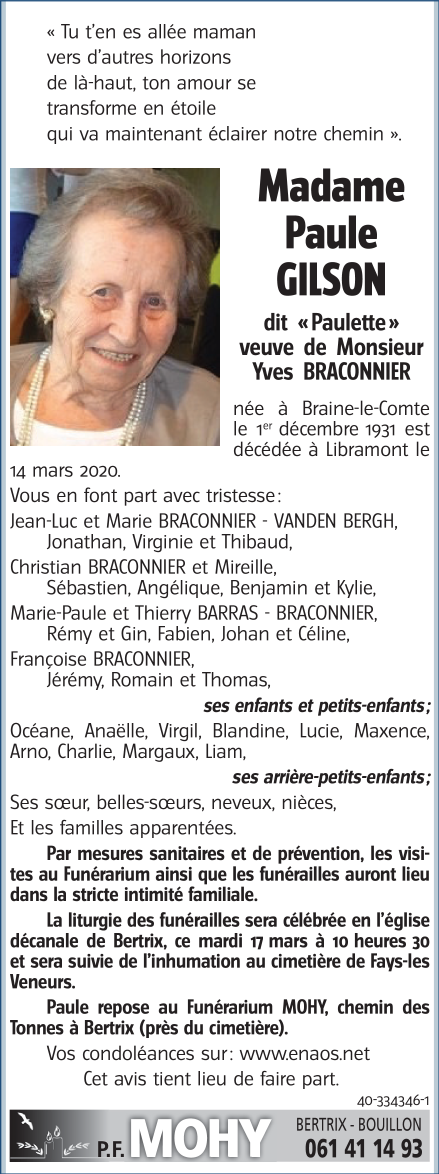 Décédée à Libramont (6800) le samedi 14 mars 2020 à l'âge de 88 ans