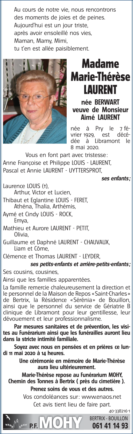 Décédée à Libramont (6800) le vendredi 8 mai 2020 à l'âge de 91 ans