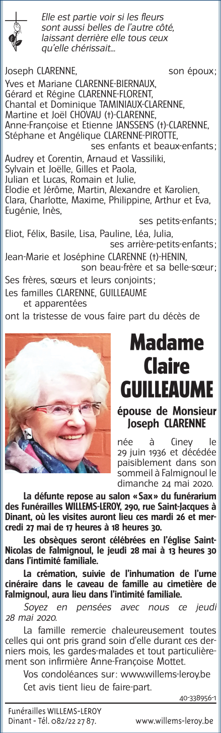 Décédée à Falmignoul (5500) le dimanche 24 mai 2020 à l'âge de 83 ans
