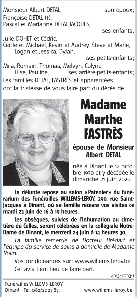 Fallecida en Dinant (5500) el domingo, 21 de junio de 2020 a la edad de 89 años