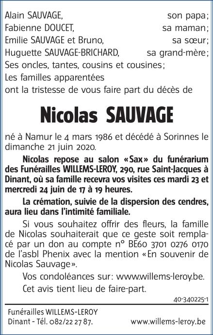 Décédé à Sorinnes (5503) le dimanche 21 juin 2020 à l'âge de 34 ans