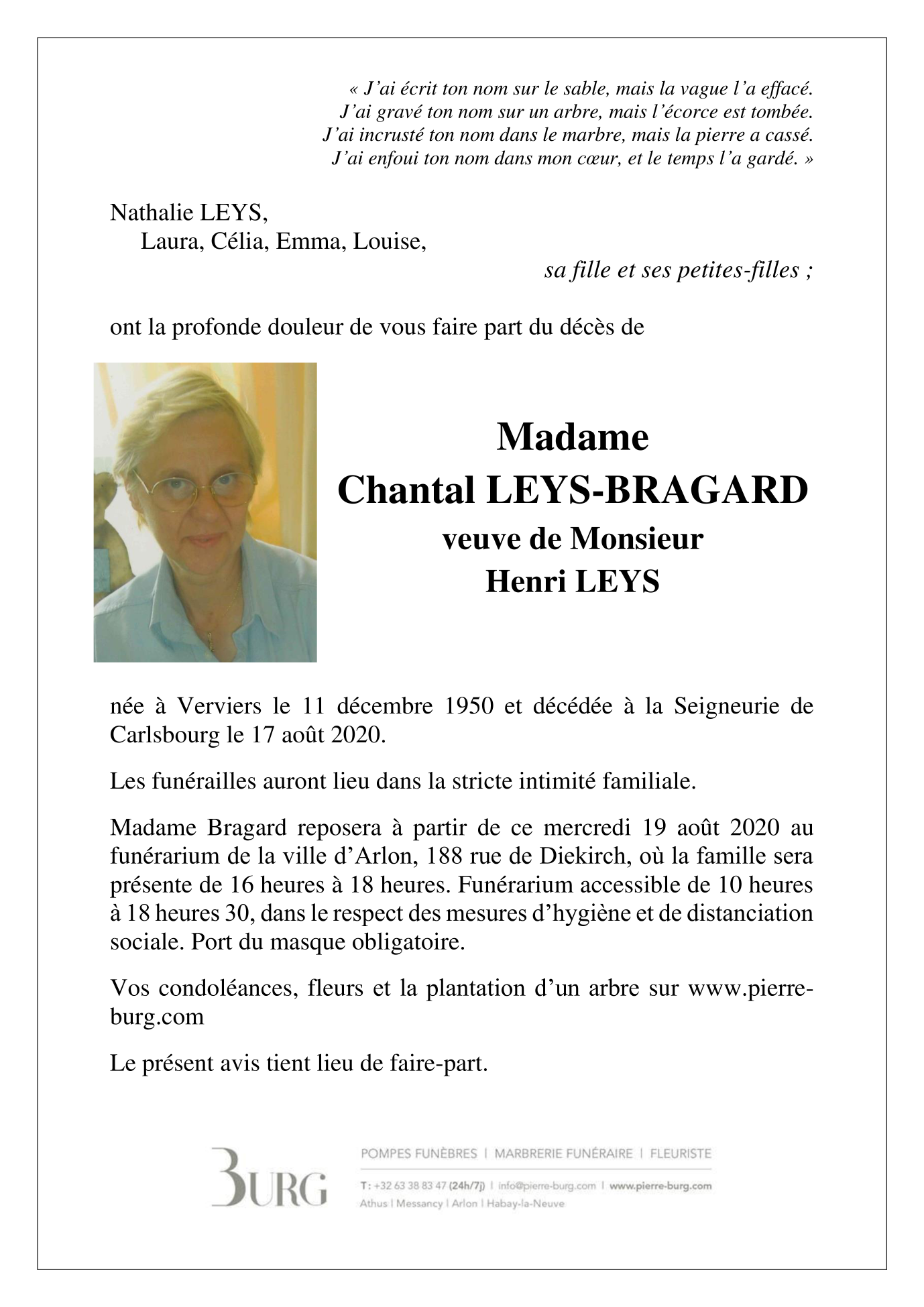 Fallecida en Paliseul (6850) el domingo, 16 de agosto de 2020 a la edad de 69 años