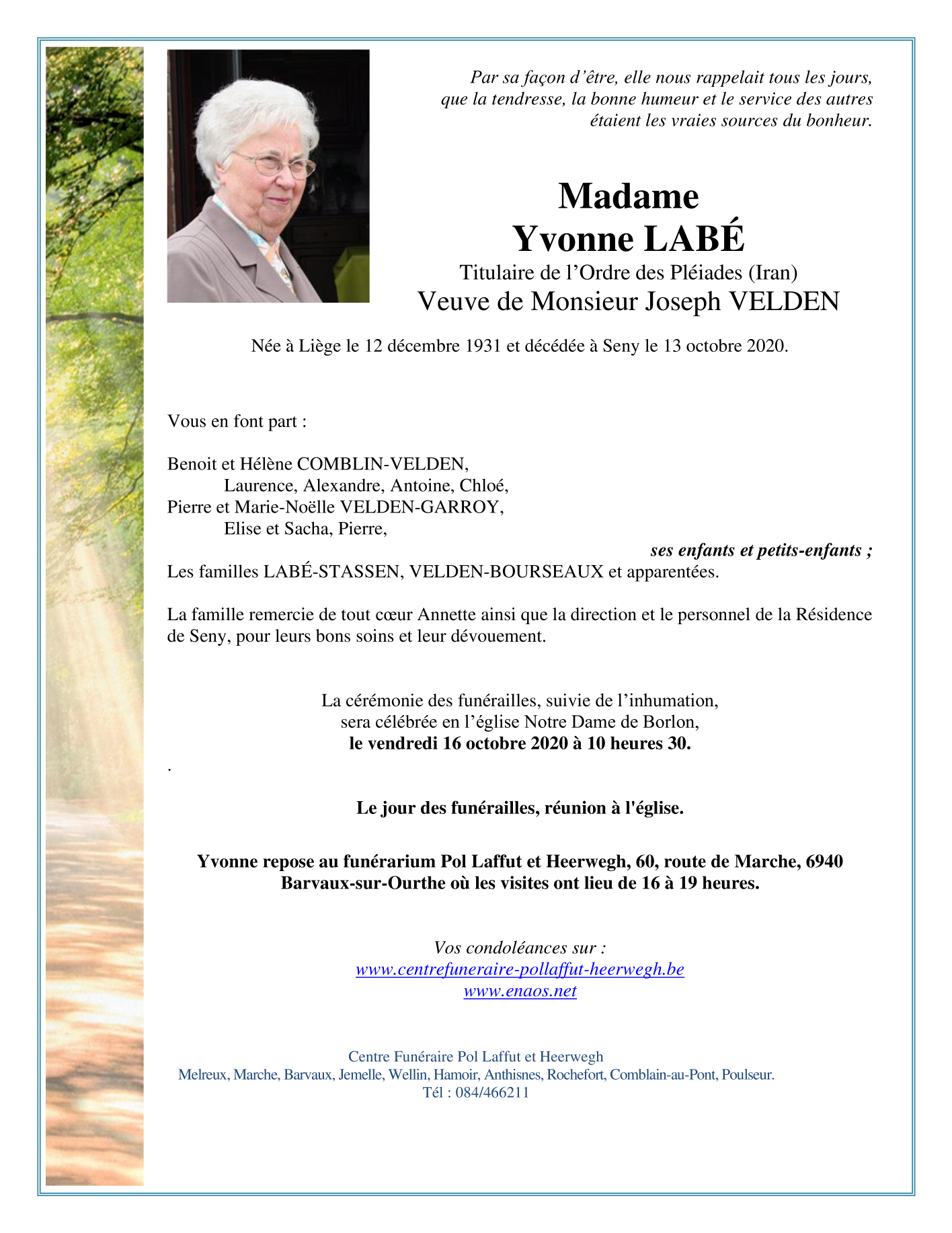 Décédée à Seny (4557) le mardi 13 octobre 2020 à l'âge de 88 ans