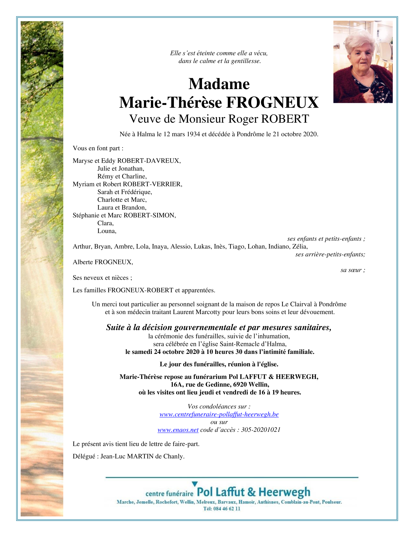 Décédée à Pondrôme (5574) le mercredi 21 octobre 2020 à l'âge de 86 ans