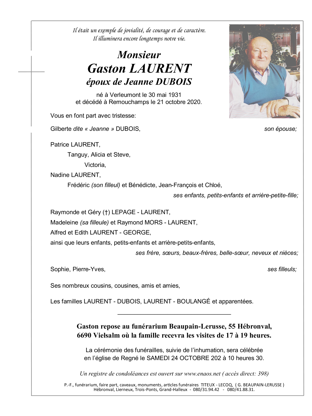 Décédé à Aywaille (4920) le mercredi 21 octobre 2020 à l'âge de 89 ans